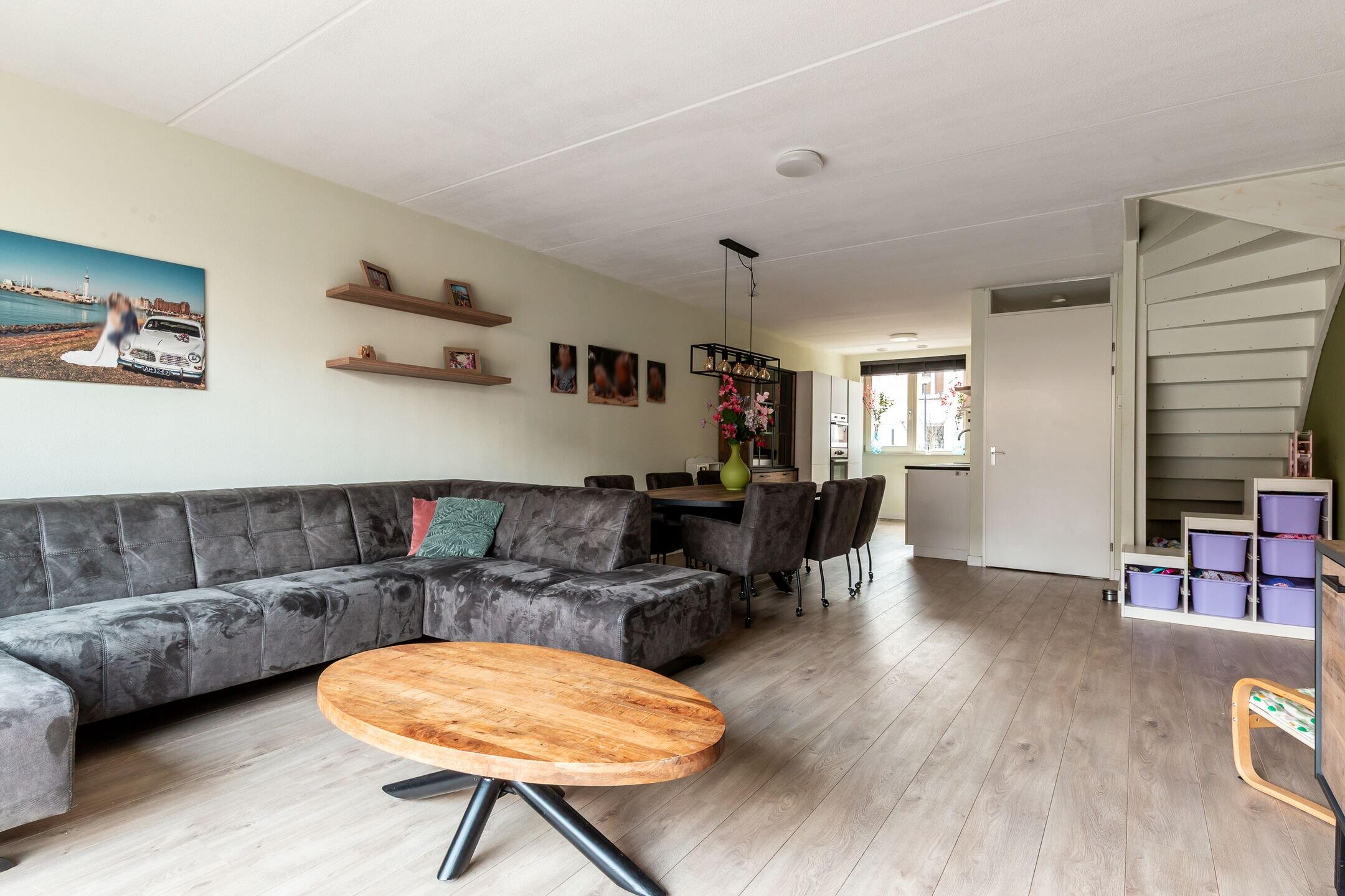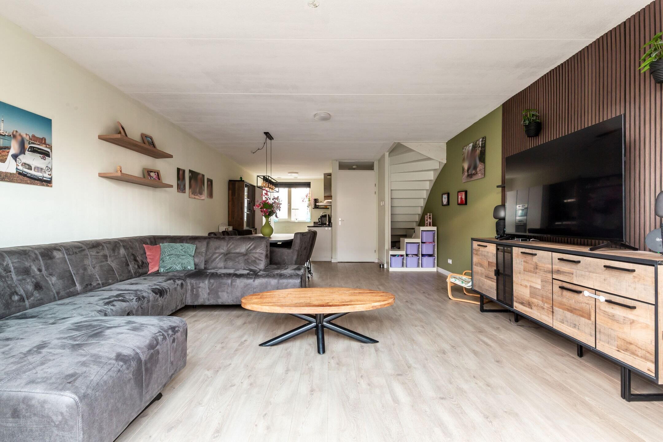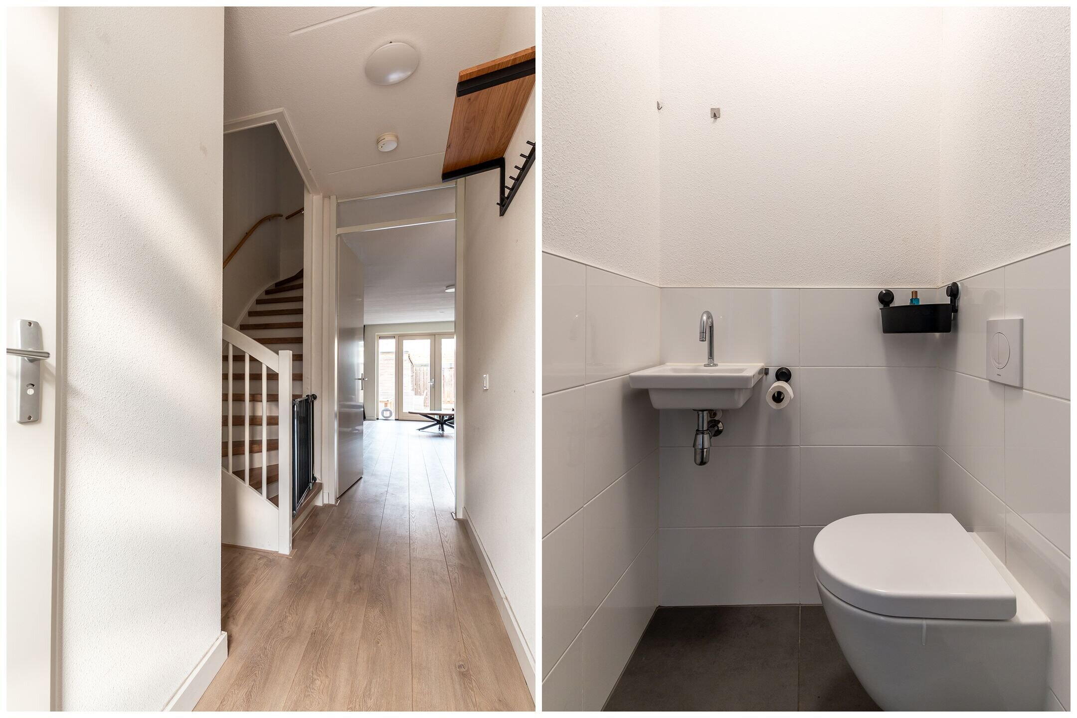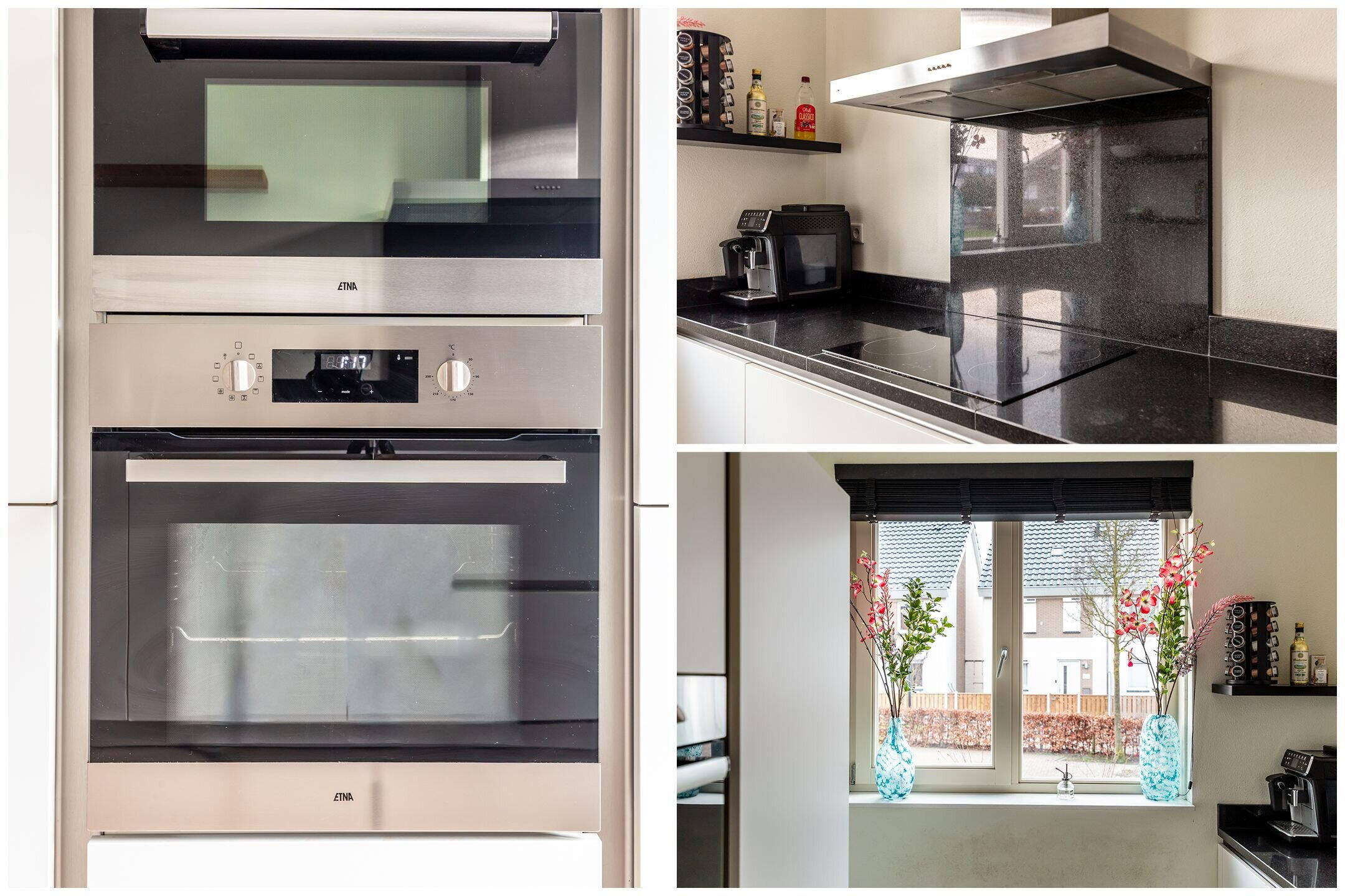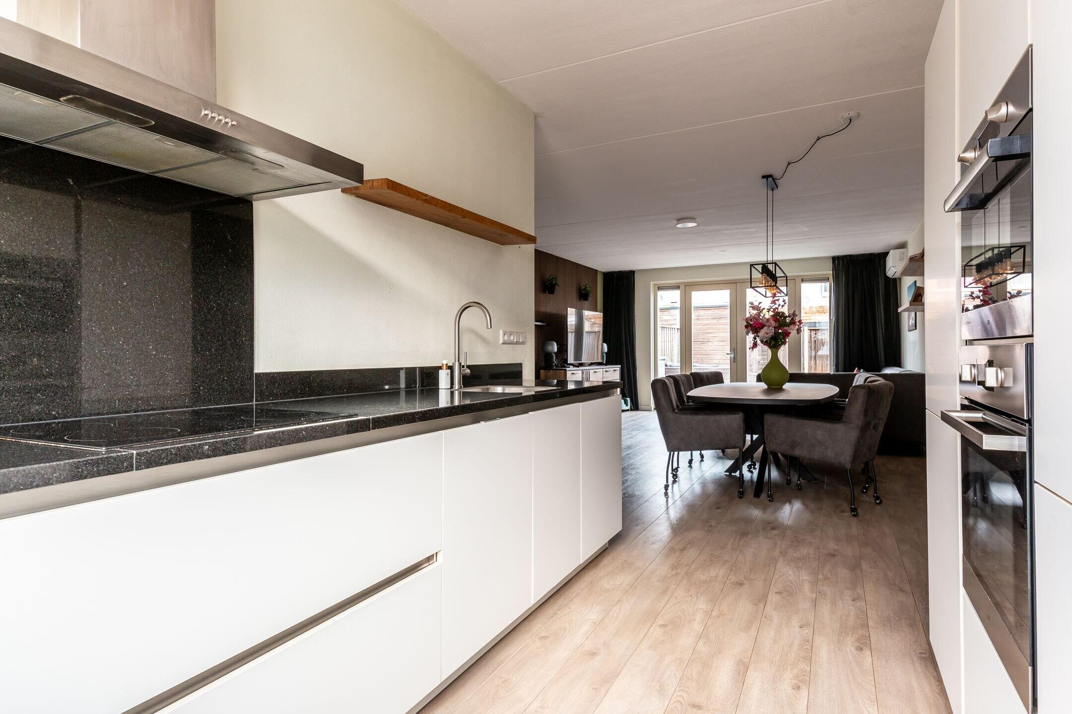 Begane grond: Entree; hal met meterkast, betegeld en vrijhangend toilet met fonteintje; tuingerichte en uitgebouwde woonkamer van ruim 35m² met openslaande deuren welke toegang geven tot de tuin; straatgerichte open keuken in dubbele rechte opstelling welke is uitgevoerd in hoogglans witte kleurstelling, beschikt over een natuurstenen werkblad en is voorzien van ondermeer een RVS afzuigschouw, 4-pits inductiekookplaat, volledig geïntegreerde vaatwasser, koelkast, ladenvriezer, oven, combimagnetron en kastruimte.