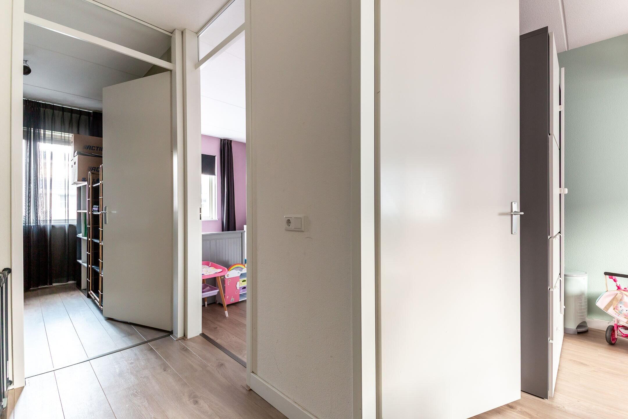 Eerste verdieping: Overloop; drie slaapkamers van respectievelijk 5,2-, 10,1- en 12,5m²; volledig betegelde badkamer welke is uitgevoerd in moderne kleurstelling en voorzien van een inloopdouche, een tweede (eveneens vrijhangend) toilet, designradiator, vloerverwarming en een wastafel.